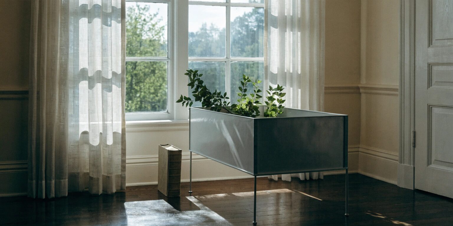 ferm LIVING Plant Box Sは、粉体塗装されたスチール製のフレーム構造で作られている。底面は閉じており、プランターをそのまま収める形になっている。
