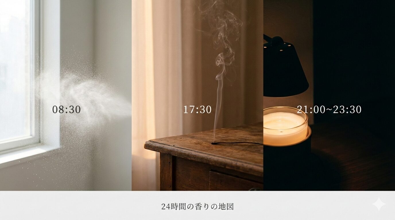 この記事では、朝・夕・夜・就寝前の4つの時間帯に「香りの道具」を置くことで、一日に物理的な境界線を作る方法を紹介しています。